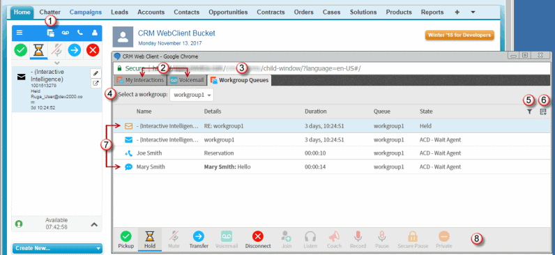 The My Interactions and Voicemail views also appear in this browser window. To manage your currently connected interaction, select the My Interactions view. |