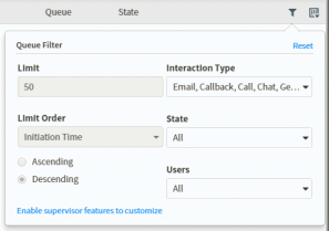 Configure filter options. You can filter interactions in a queue view by type, state, and assigned user. If you have an Interaction Supervisor Plug-In: Workgroup license and enable Supervisor Features, you can configure the maximum number of interaction displayed and the order in which the interactions are retrieved from the CIC server. For more information, see Filter a Queue View.