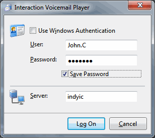 Interaction Voicemail Player uses the same connection data (user name and server name) as the CIC client. If you selected Save Password in the CIC client Logon dialog box, it also uses the same password. If you have ever successfully logged on to the CIC client, then this same connection data is automatically used to log on to Interaction Voicemail Player.