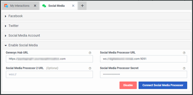 Note: As part of the Sales process, your account manager arranges for a support representative to set up a Social Media Processor for you in the Genesys Cloud. Your account manager then provides you with the necessary information for this part of the configuration.