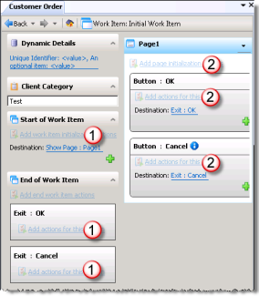 Click the appropriate links to add actions to a work item (1) or a work item page (2) in the Work Item Overview view (see figure).