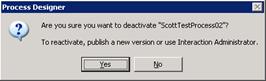 Appropriate user rights are required to publish, deactivate, or delete a process. If IPA Designer shows an error message when you try to do those tasks, contact your system administrator to obtain the required user rights.