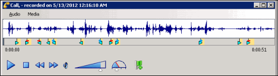 Use the Audio menu to select the audio device for the playback. The options are Primary Sound Driver or Telephone Handset. The default audio device is displayed in the Audio menu in a bold font. The active (currently selected) Audio device menu item is selected (checked). You can also make the selected Audio device the default on this menu. Audio timing indicators display the current position in the recording and the total time of the recording.