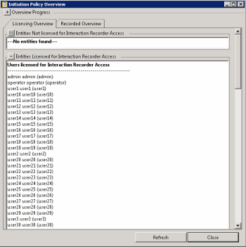 The Licensing Overview tab lists every user and station by type on the server, in the Entities Licensed for Interaction Recorder Access box or Entities Not Licensed for Interaction Recorder Access box.