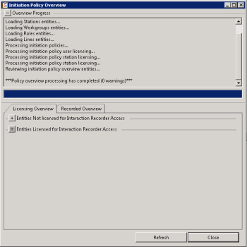 The Overview Progress box is at the top of the dialog and displays each step in the policy analysis along with any warnings. Warnings are displayed if any entities are not licensed or not recorded. Warnings are also displayed if your Initiation policies contain Abandon Recording or Stop Processing actions. A warning also appears if Policy Editor is run against an older server, stating that the licensing information is unavailable. When no warnings occur, the Overview Progress box is collapsed.