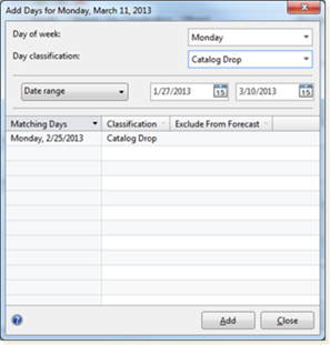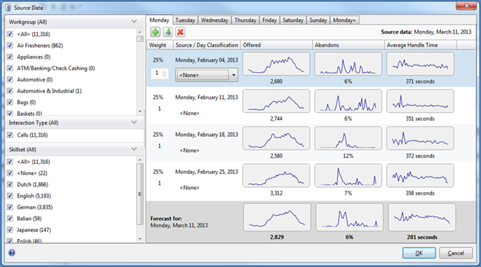 In addition to specifying the default amount of historical data, the user can select individual days and weeks to add to the forecast, and can search for specific day classifications. In this new interface, the user can use day classifications as the source data for a forecast, or remove day classifications from the forecasting process.