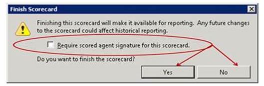 Upon completion of a quality scorecard, the scorer/evaluator is presented with a Finish Scorecard pop-up dialog box to confirm that they want to "finish" the scorecard - a feature that is not new. A new check box on the dialog box enables the evaluator to require the agent to sign the scorecard.