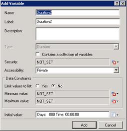 Right-click a blank area of the Variables workspace, point to Add, and click Duration in the shortcut menu.