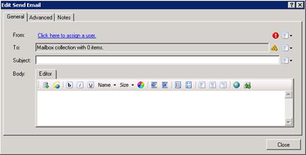 WARNING: If you insert a variable reference in the body of the message (see The Send E-Mail Toolbar), the Process Automation Server does not apply the variable's security specification to the message content. Any recipient of the message will be able to view the variable's value, whether or not that recipient has the appropriate security permissions.