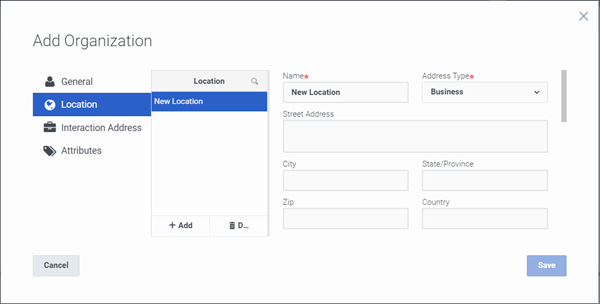 In the Location view,complete the necessary information for as many locations as needed and then select Interaction Address.
