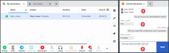 The Current Interaction view displays a Chat conversation. You can use the Current Interaction view to review the conversation and send text to the other chat participants.