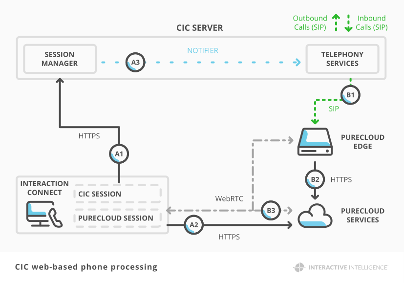 PureCloud Services facilitates the exchange of signaling messages and application data between PureCloud Edge and Interaction Connect to establish a WebRTC session. |