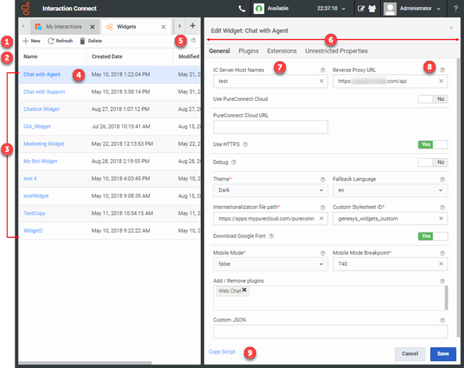 New (Add), Refresh, and Delete controls. To update the Widgets view and display any new Widget configurations created by other Interaction Connect users, click Refresh Note: The Widgets view does not update automatically. |