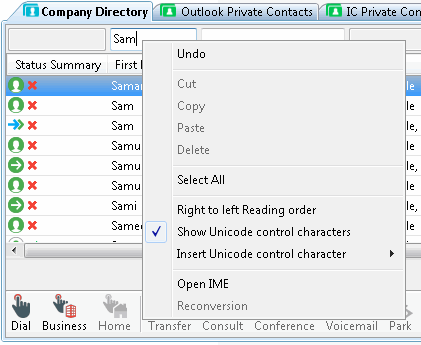 The context menu enables you to use the Windows clipboard to copy and paste text in the search fields. Right to left Reading order is available for RLT languages, such as Hebrew and Arabic. The Show Unicode control characters, Insert Unicode control character, Open IME, and Reconversion options are available for Asian languages. Windows provides these options. See http://technet.microsoft.com/library/Dd361903 for more details.
