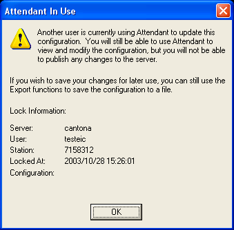 This dialog appears when another person is editing the configuration of the server you are connected to. When you press OK to dismiss the dialog, you can use Attendant to view and modify the configuration, but it will not allow you to publish changes to the server.