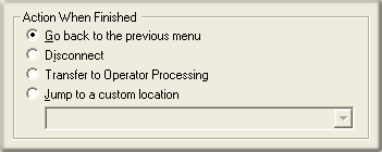 These options set the processing that occurs after the operation completes successfully, when flow of control leaves this node. You can return control to the previous menu, disconnect the call, transfer to an operator profile, or jump to any node or action that has been defined for the current server.