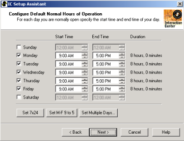 Setup Assistant displays this dialog to collect information about your company's normal hours of operation. The information provided is used to add a Custom Inbound Call Schedule node to the inbound call flow.