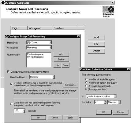 Setup Assistant uses another screen to configure a list of menu items associated with workgroups defined earlier within the wizard. For each menu item, a digit, workgroup, and optional overflow queue is specified. The figure below shows the wizard page and related dialogs that configure workgroup transfers in Setup Assistant.