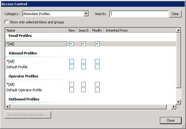 View rights grant read-only access to individual Profiles, or to all Profiles when *[All] is selected. A user who has read-only rights to an Attendant configuration cannot publish or export the server's configuration, and may not browse or record prompts (since doing so might change prompts stored on the server). Read-only rights are similar to access granted when another user has locked an Attendant configuration. The difference is that a locked configuration may be exported by the user, while a read-only configuration may not be exported. Search rights determine which Interaction Attendant profiles are available in the "Transfer to" box. Users who can view a profile have a lock on the Profile icon. A tool tip is displayed over the icon, explaining why the profile is locked. Modify rights grant the ability to view, modify, publish, and export Profiles within a call flow type. Administrators can restrict access to individual Profiles, or grant access to all Profiles by selecting *[All] for a right. |