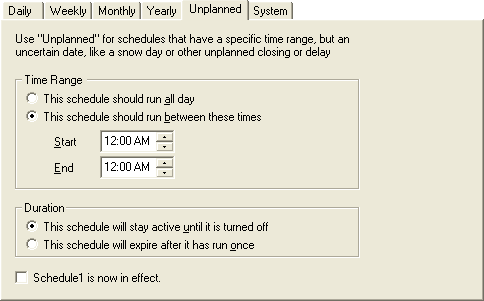 To activate an unplanned schedule, check the schedule is now in effect check box, or use remote access services to activate the schedule remotely using a touch-tone telephone. To activate a schedule using the telephone, you must have system administrator rights. To learn how to use remote access services, see Remotely Activate an Unplanned Schedule.