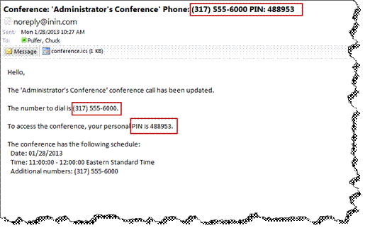 Once a conference has been scheduled, invitees receive an email message that provides the information they require to join the conference, such as the number to dial, the PIN number, and the date and time. Here is an example: