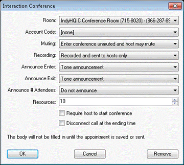Click OK to save the options specified on the Interaction Conference options dialog. This does not create the conference – it only saves the options. Click the Conference button on the Outlook Appointment or Meeting page to edit the options again. Click Save and Close or Send on the appointment to actually create the conference entry on the Interaction Conference server.