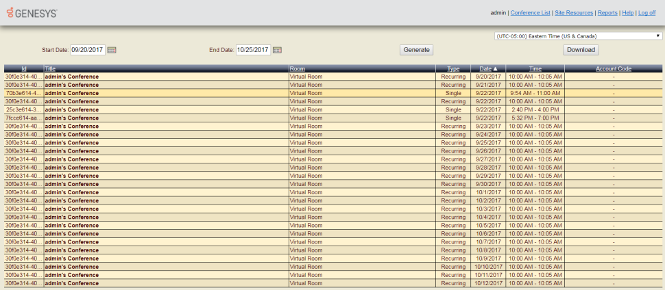 This report lists conferences sorted by date. All conferences are listed by default. To filter the list to specific start and end dates, click the calendar icon next to the date fields above the detail lines. Then click Generate to apply the date parameters to the report. You can click column headings to sort columns. The columns are: