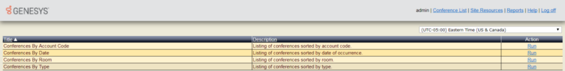 Interaction Conference provides four simple reports that you can filter by date range, and which are sorted by different report configuration data. To see the list of reports, click the Reports hyperlink at the top of the Interaction Conference web application. The reports are sorted and named accordingly: