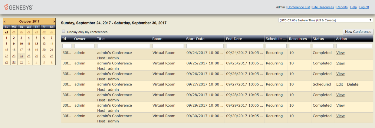 The Conference List appears when you log on to Interaction Conference and when you click the Conference List hyperlink. This page lists scheduled and completed conferences for the week containing the date selected in the calendar control. This list includes recurring conferences valid in the selected dates.