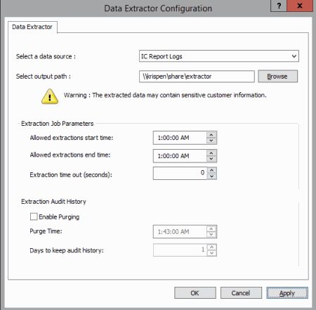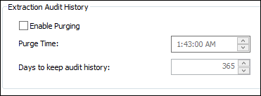In the Extraction Audit History box, set the values for the extraction audit record purge. The audit history is used to populate the extraction job history.