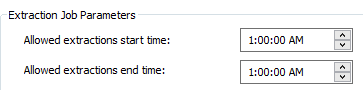 In the Extraction Job Parameters box, set the extraction window start and end times. This window specifies the time frame for when extraction jobs can begin. If you want a 24 hour start-time window, set the start and end times to the same value.