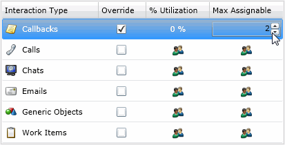 • To override the interaction type's % Utilization and Max Assignable for each Interaction Type, select the Override check box, then use the arrow keys or type in the fields to set the values: