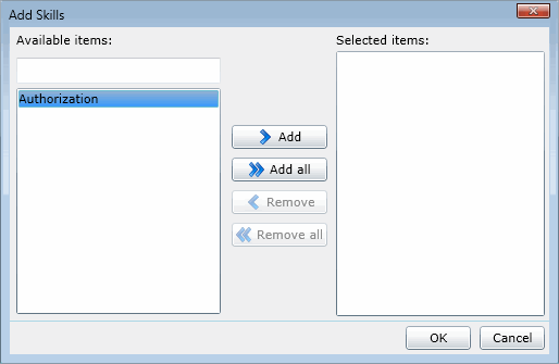 Select one or more skills in the Available items list, and click Add to add the skill(s) to the Selected items list. You can also click Add all to add all skills. To filter the list of skills, type in the filter field above the list. If there are no previously configured skills, there are no entries in list of available items.