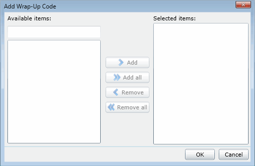 Select one or more codes in the Available items list, and click Add to add the code(s) to the Selected items list. You can also click Add all to add all codes. To filter the list of codes, type in the filter field above the list.