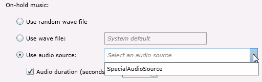 Select the type of On-hold music to be played to the caller. If Use wave file is selected, type the file name or accept the default. If Use audio source is selected, use the drop-down menu or type in the name of the audio source to play.