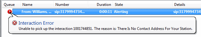 An Interaction Error icon appears if you are unable to pick up an interaction. A tooltip for the icon explains the reason for the problem. Contact your CIC administrator for help in resolving this issue.