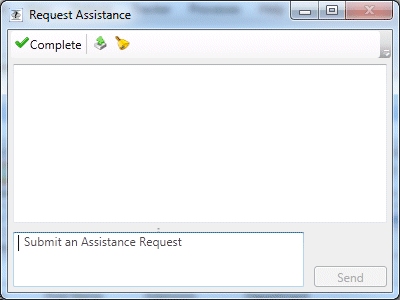 When you click the Assistance button in My Interactions or the Chat Window, the Request Assistance dialog box appears. You enter a problem description and click Send.