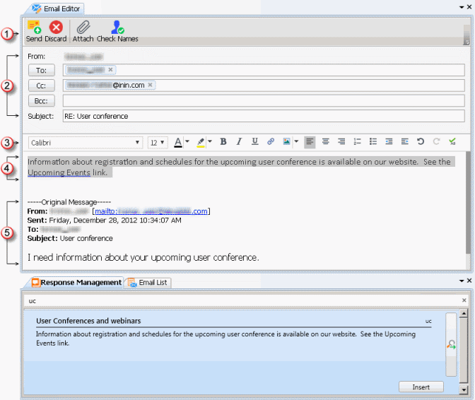 Important: If you do not or cannot display the Email Editor, you can use the Email Window for Incoming Messages and Email Window for Outgoing Messages to view and respond to your email messages.