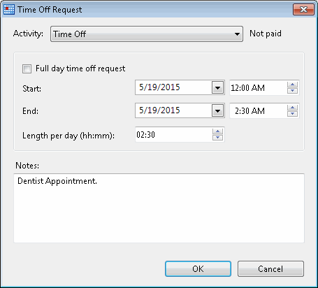 Tip: For detailed instructions on entering information in the Time Off Request List dialog box, see Submit a Time-Off Request.