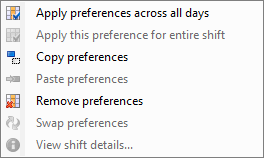 To swap all the work preferences between two days, select a day from the Day control, press and hold Shift and then select the second day from the Day control. Right-click and select Swap preference(s) from the shortcut menu.