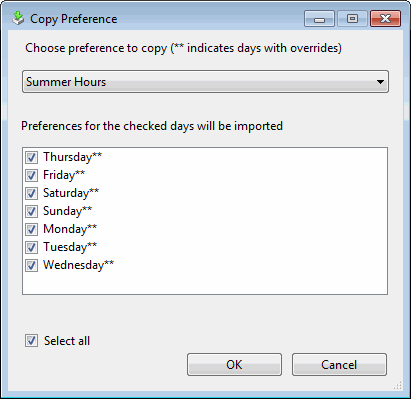Select one or more days from the Day control and then copy, paste or remove an entire day’s work preferences in one operation.