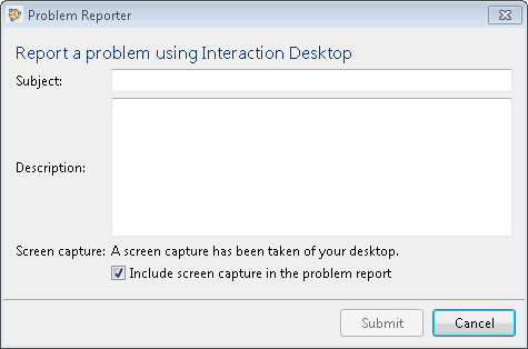 The Report a Problem option enables you to report a problem to your support representative. The Problem Reporter automatically creates an email message and addresses it to your designated representative. The Problem Reporter also uploads a copy of your CIC client logs and, optionally, a screen capture of your desktop to your organization's CIC server.