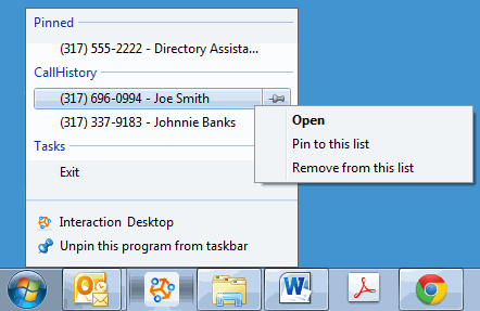 Note: Pinned numbers remain in the jump list even after they are removed from the Call History view.