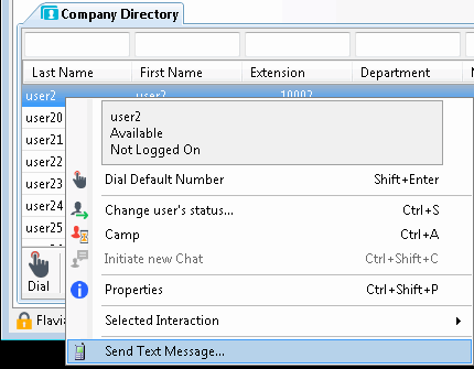 After CIC administrator enables the Short Message Service plug-in for the CIC client, an Actions menu appears and the directory shortcut menu contains a new option, Send Text Message. For more information, see Send a Text Message.