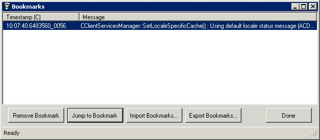 This button is enabled when a single bookmark is selected. Use it to navigate to the selected log entry.
