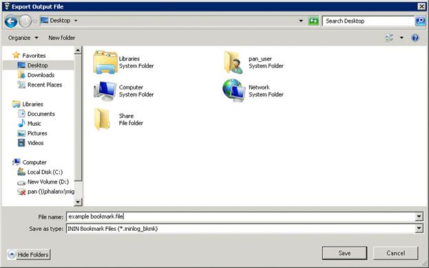 Opens the Export Output file dialog so that you can name a file to save the bookmarks you have selected in the Bookmarks dialog. Bookmark files have an extension of .ininlog_bkmk.