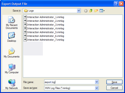This dialog prompts for the name of an exported log file. It is a standard Windows Save As dialog box. Type a new name in the File name field, and then click Save. An .ininlog extension is automatically added to the file name..