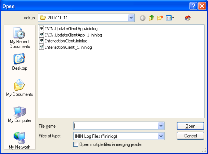 This dialog is invoked by pressing Ctrl+O or by selecting Open from the File menu. Use this dialog to navigate to the folder that contains a log file you want to open.