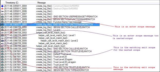 The enter/exit messages have a unique icon that looks like an arrow. If you open a log and put the focus on an "enter scope" message and clic Jump to Matching Scope, the focus jumps to the matching enter/exit scope, whether that is forward or backward from the current position. If you are on a regular Note, Warning, or Error message, then that action has no matching twin and a beep sounds.