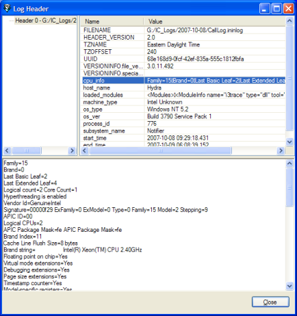 When you finish, click Close to dismiss the Log Header dialog box.